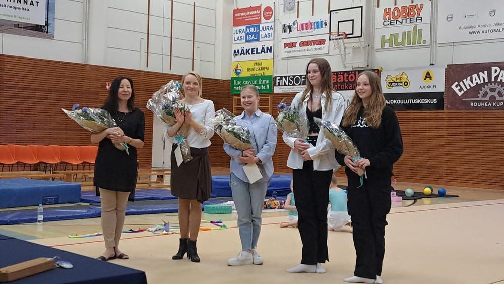 Näytöksen päätteeksi muistettiin ansioituneita urheilijoita, jotka olivat kevään aikana suorittaneet Voimisteluliiton merkkisuorituksia sekä jokaisesta ryhmästä kevään tsemppareita.