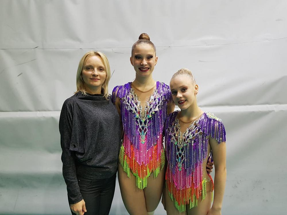 Duo/trio -kilpailussa Duo Marina Senjuk ja Suvi Vartiainen voimisteli niin ikään kultaa nuorten duo/trio -sarjassa kahden nauhan ohjelmallaan. Ensimmäisestä hyvin sujuneesta näytöstä, tytöt saivät pisteet 11.100. Seuravaan näyttöön mahtui enemmän virheitä ja pisteet jäivät matalammaksi, ollen 9.117. Yhteispisteillä 20.217 Duo Senjuk, Vartiainen palkittiin kultaisin mitalein. Elise-Vantaan Duo Helmi, Jyrkönen voimisteli hopealle yhteispistein 14.283. Myös seuramme duoa valmentaa Natalia Burmak.